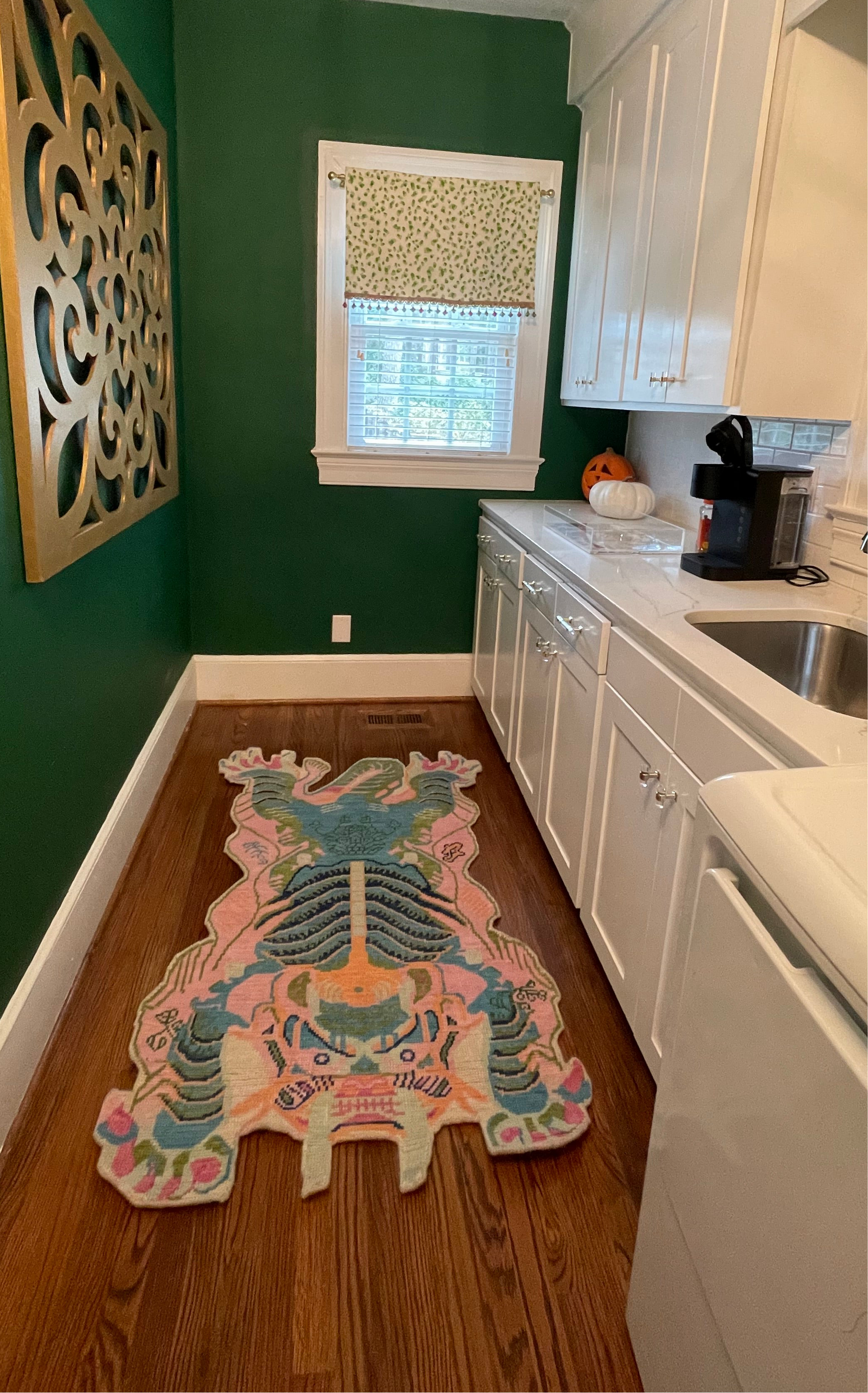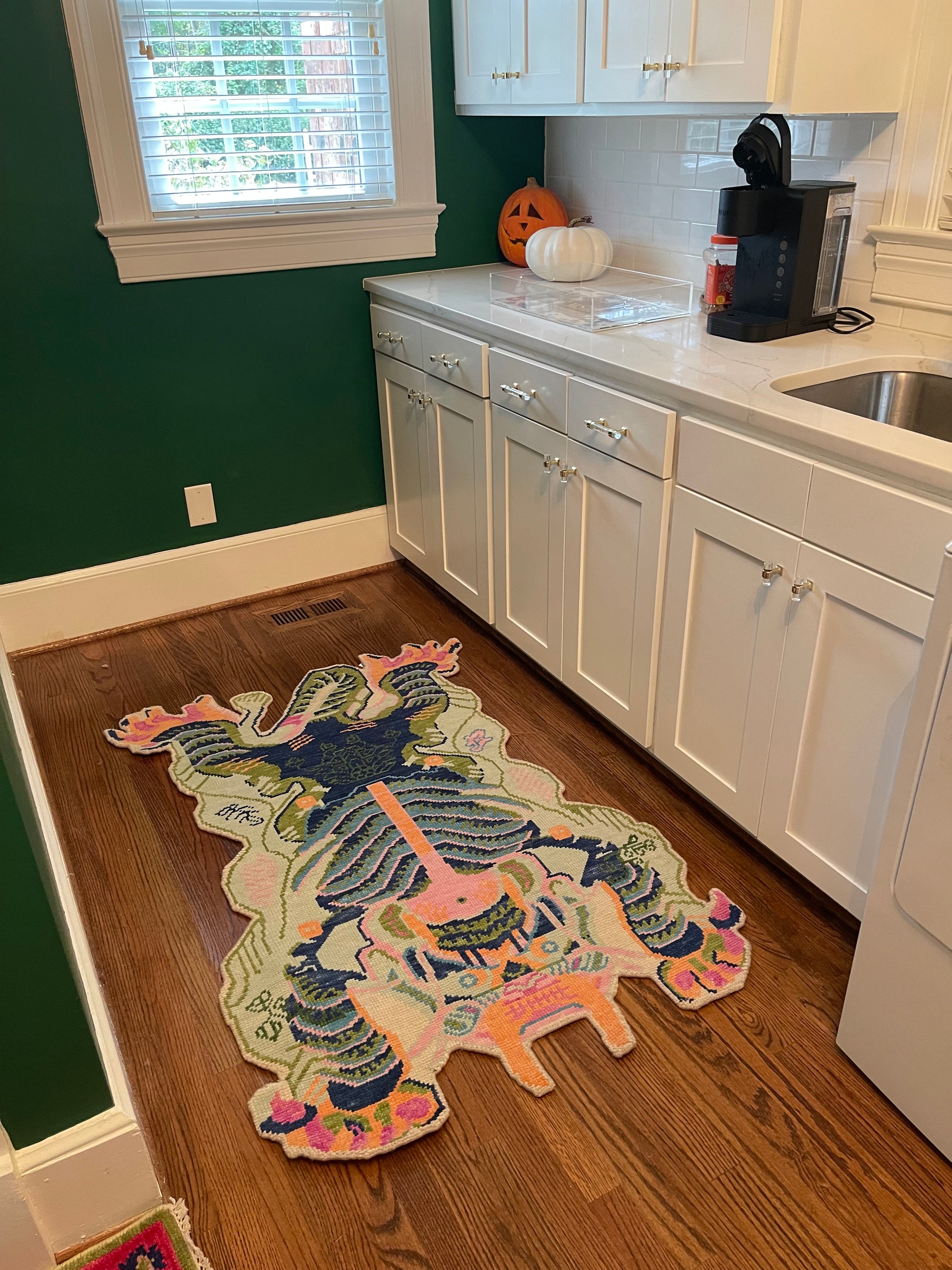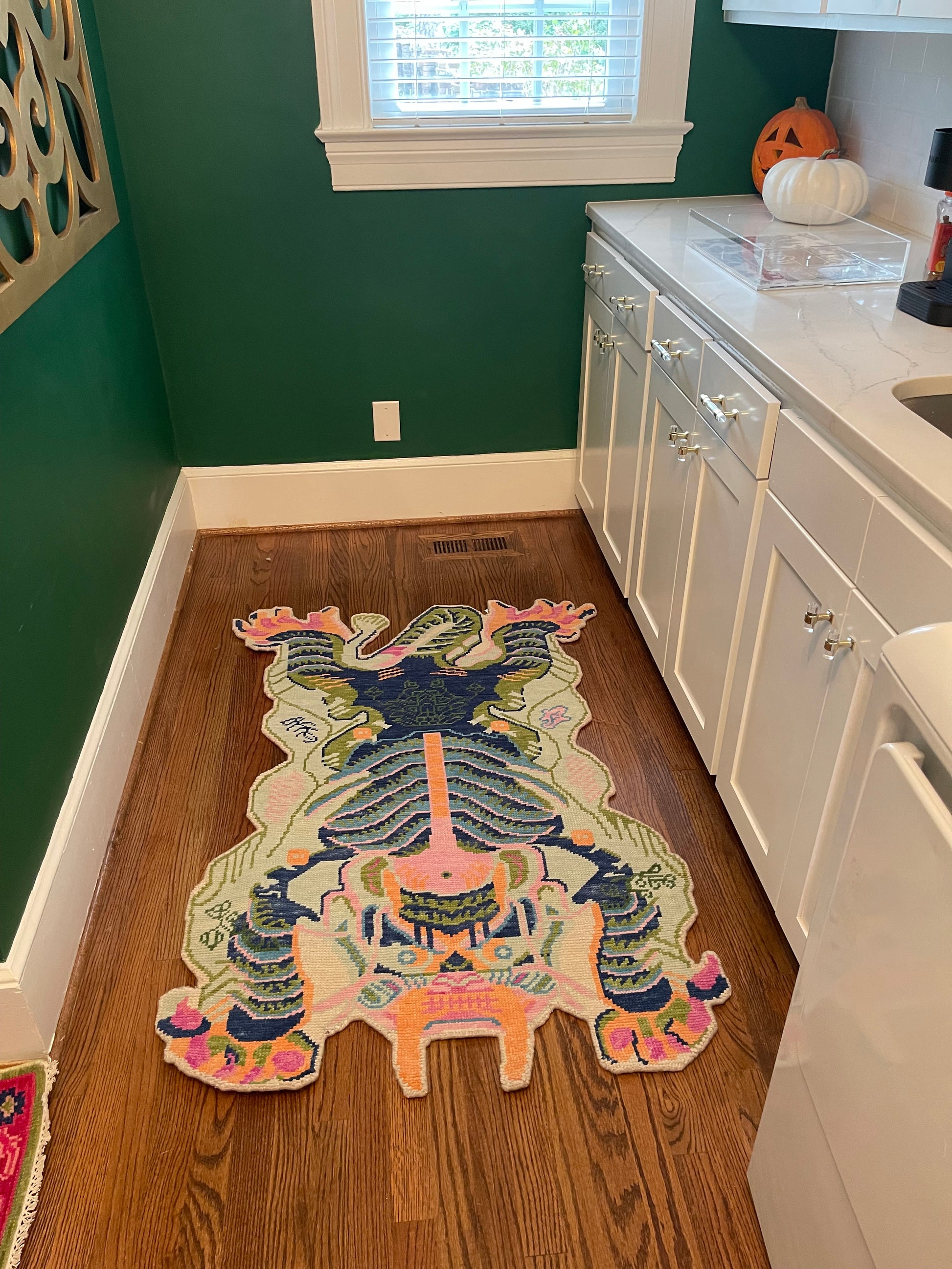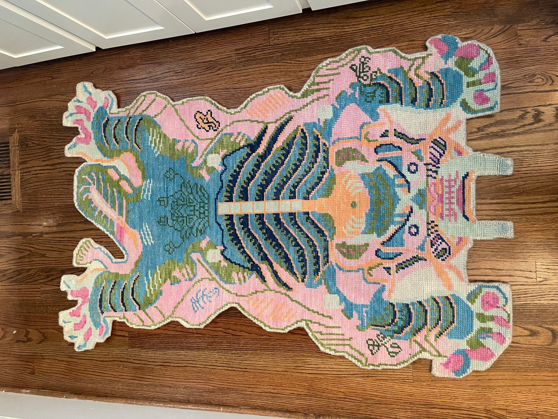 A bold statement piece, the Dragon Cut Out Rug is hand-knotted from 100% wool in India. Its sculptural silhouette and intricate craftsmanship highlight the artistry of traditional rug making while adding a modern edge. The cut-out design brings depth and dimension, making it as much an art piece as it is a functional rug. Crafted to last, its rich wool texture offers warmth and durability, perfect for anchoring any room with a touch of whimsy and sophistication. This rug is 3 X 5!